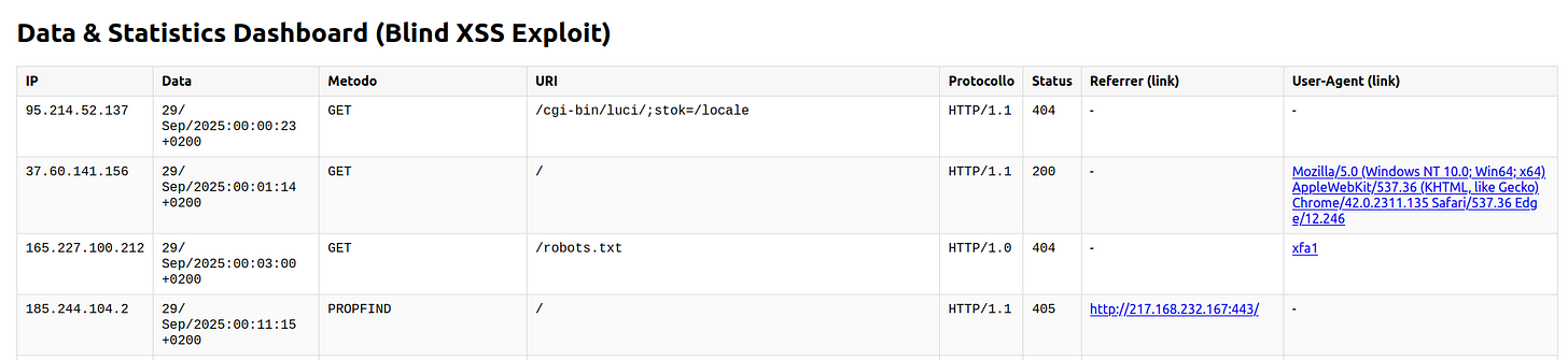 In this case, the attacker doesn’t directly target visitors but the people managing the backend. This can allow for cookie theft, administrative session hijacking, or injection of additional malicious scripts.